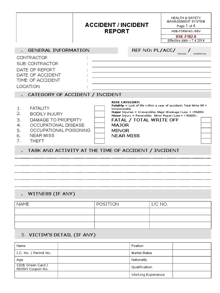 Hse F102 0 Accident Report from imgv2-1-f.scribdassets.com Thus, people who are involved in compiling facts about a particular menace can effectively download and edit such samples for free. Safety officers, as well as drivers and fleet managers, can use this vehicle accident report to perform the following: Often a formal report or a description is necessary to be presented before the court. Mar 30, 2020 · after the accident report is filed, make sure you get a card and/or direct contact information from the police officer who filed the report. When initiating a search, the accident date or date range must be entered. This report must be filed within thirty (30) days of the accident. Often after an accident, you may only remember details after you've rested and calmed down. Accident reports typically will not be posted to this web site until at least 5 days after the accident has occurred.
